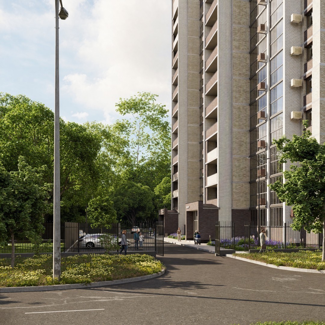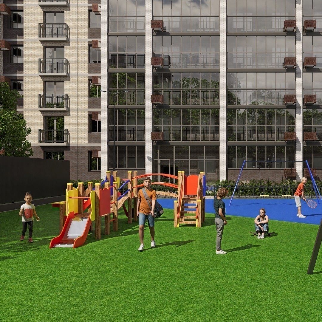 Предусмотрено благоустройство прилегающей территории в виде размещения дворовых и спортивных площадок с искусственным покрытием. Тротуары из тротуарной плитки, парковочные места и освещение дворовой территории. Вокруг территории детской и спортивной площадок предусмотрено леерное ограждение и озеленение территории жилого дома.